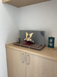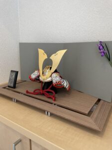 玄関の棚に、鈴甲子雄山作の兜をお飾りしました。