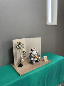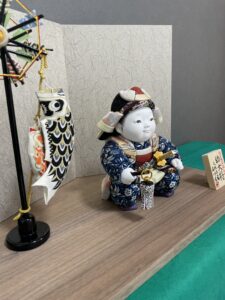 棚に緑の毛氈をかけて石川佳正作「幼武者大将」をお飾りしました。
