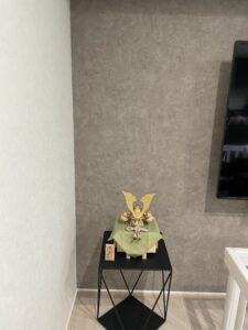 リビング壁掛けテレビの隣りに鈴甲子雄山作兜をお飾りしました。